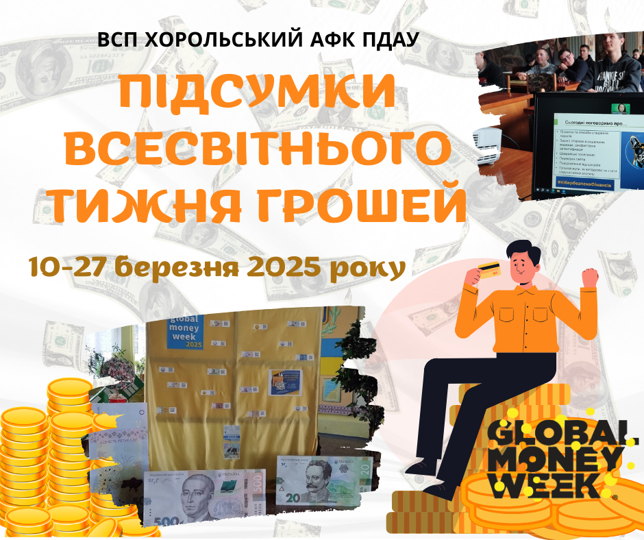 Підготовка звіту про проведення Всесвітнього тижня грошей (Global Money Week) 2025 року дала змогу ще раз пригадати усі заходи і враження від їх проведення. Протягом двох тижнів у Відокремленому структурному підрозділі «Хорольський агропромисловий фаховий коледж Полтавського державного аграрного університету» командою викладачів методичної циклової комісії економічних дисциплін було організовано і проведено низку заходів, спрямованих на підвищення рівня фінансової грамотності студентської молоді.