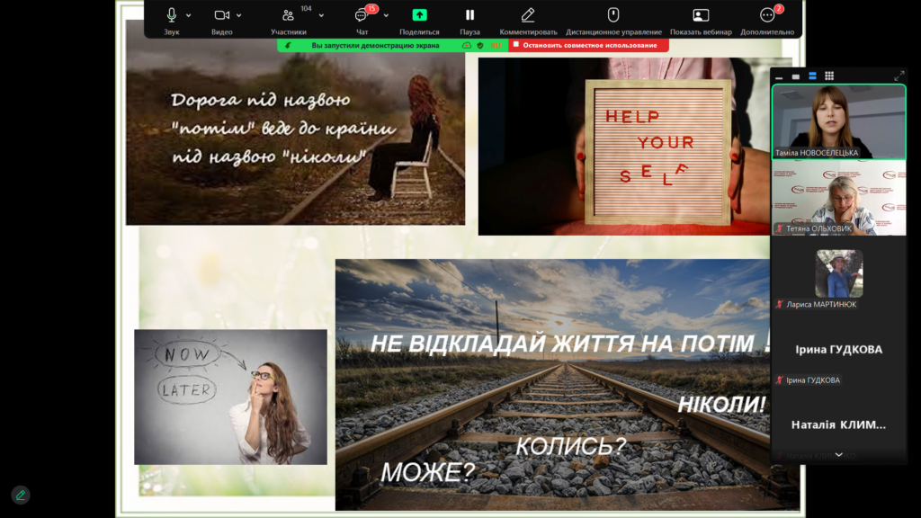 10 червня на одному з вебінарів була представлена робота «Подолання синдрому відкладеного життя в контексті особистісно зорієнтованого навчання» Новоселецької Т.В., викладача філологічних дисциплін ВСП Хорольський АФК ПДАУ, у номінації «Виховання студентської молоді у закладі фахової передвищої освіти в умовах сучасних викликів».