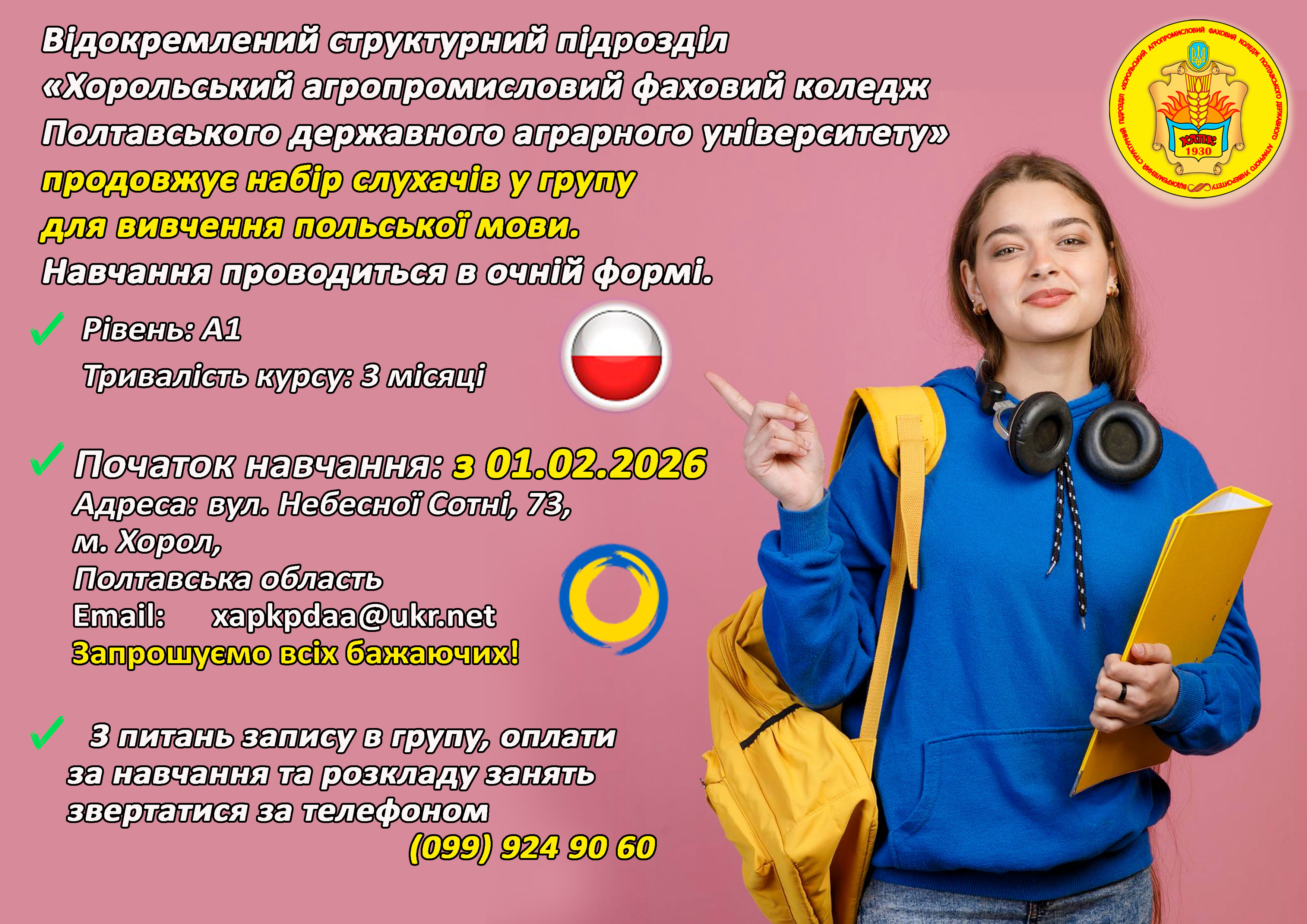 Новини УВАГА!ПРОДОВЖУЄТЬСЯ НАБІР НА КУРСИ ПОЛЬСЬКОЇ МОВИ! 14.01.2026 Поділитися на Facebook Поділитися на Twitter