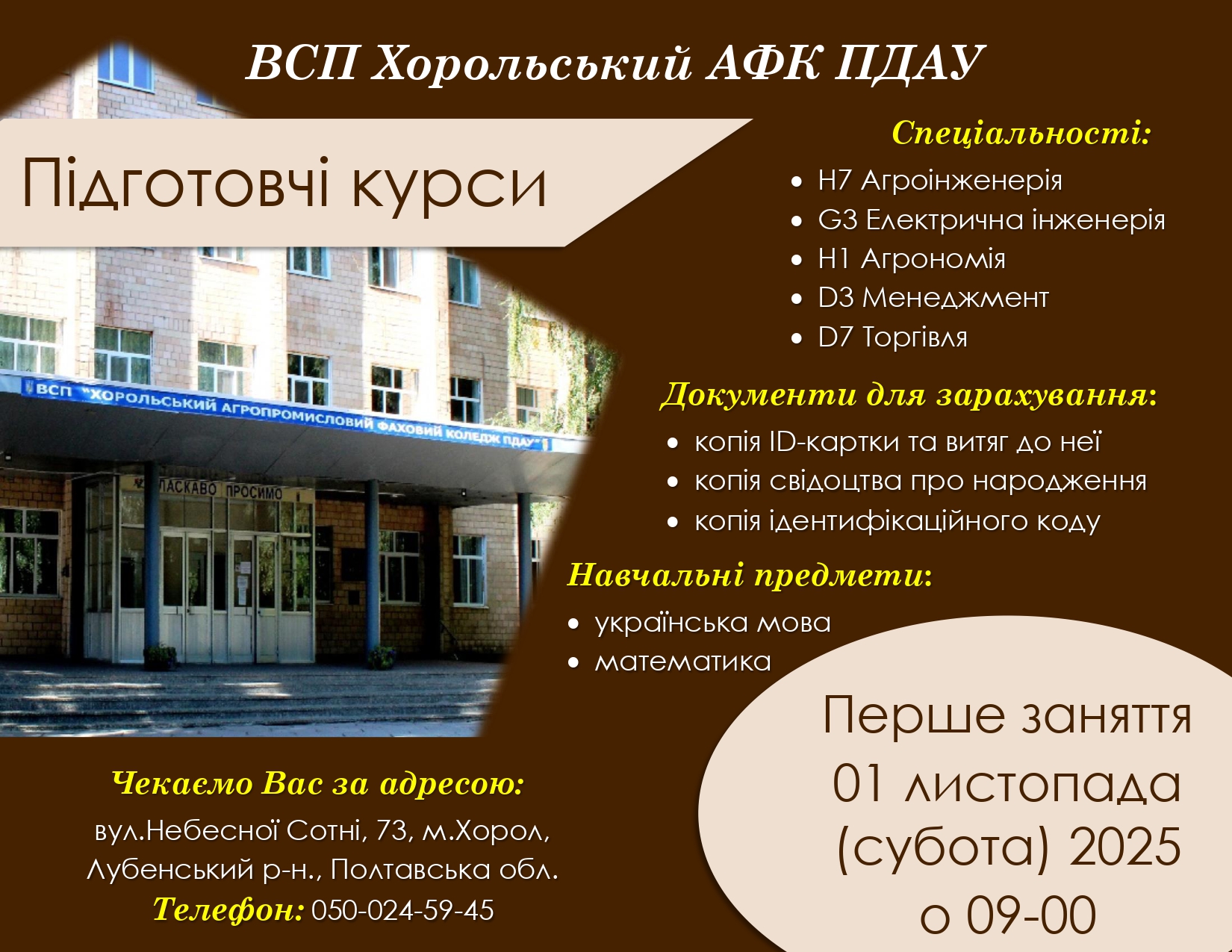 У ВСП „Хорольський агропромисловий фаховий коледж Полтавського державного аграрного університету“ підготовчі курси працюють з листопаду 2025 року по квітень 2026 року.